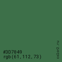 Цвет #3D7049 в цветовой модели RGB обозначается тремя октетами (61, 112, 73) в десятичном формате и #3D7049 в шестнадцатиричном (hex) формате, которые являются интенсивностью красного 61 (hex 3D), интенсивность зелёного 112 (hex 70) и интенсивность синего 73 (hex 49).