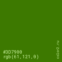 Цвет #3D7900 в цветовой модели RGB обозначается тремя октетами (61, 121, 0) в десятичном формате и #3D7900 в шестнадцатиричном (hex) формате, которые являются интенсивностью красного 61 (hex 3D), интенсивность зелёного 121 (hex 79) и интенсивность синего 0 (hex 00).