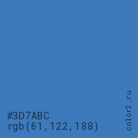 Цвет #3D7ABC в цветовой модели RGB обозначается тремя октетами (61, 122, 188) в десятичном формате и #3D7ABC в шестнадцатиричном (hex) формате, которые являются интенсивностью красного 61 (hex 3D), интенсивность зелёного 122 (hex 7A) и интенсивность синего 188 (hex BC).