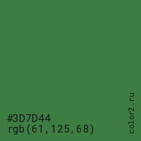Цвет #3D7D44 в цветовой модели RGB обозначается тремя октетами (61, 125, 68) в десятичном формате и #3D7D44 в шестнадцатиричном (hex) формате, которые являются интенсивностью красного 61 (hex 3D), интенсивность зелёного 125 (hex 7D) и интенсивность синего 68 (hex 44).