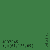 Цвет #3D7E45 в цветовой модели RGB обозначается тремя октетами (61, 126, 69) в десятичном формате и #3D7E45 в шестнадцатиричном (hex) формате, которые являются интенсивностью красного 61 (hex 3D), интенсивность зелёного 126 (hex 7E) и интенсивность синего 69 (hex 45).