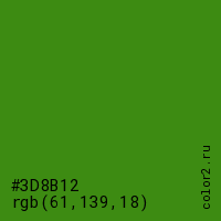 Цвет #3D8B12 в цветовой модели RGB обозначается тремя октетами (61, 139, 18) в десятичном формате и #3D8B12 в шестнадцатиричном (hex) формате, которые являются интенсивностью красного 61 (hex 3D), интенсивность зелёного 139 (hex 8B) и интенсивность синего 18 (hex 12).