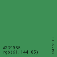 Цвет #3D9055 в цветовой модели RGB обозначается тремя октетами (61, 144, 85) в десятичном формате и #3D9055 в шестнадцатиричном (hex) формате, которые являются интенсивностью красного 61 (hex 3D), интенсивность зелёного 144 (hex 90) и интенсивность синего 85 (hex 55).