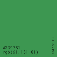 Цвет #3D9751 в цветовой модели RGB обозначается тремя октетами (61, 151, 81) в десятичном формате и #3D9751 в шестнадцатиричном (hex) формате, которые являются интенсивностью красного 61 (hex 3D), интенсивность зелёного 151 (hex 97) и интенсивность синего 81 (hex 51).
