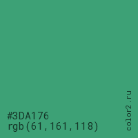 Цвет #3DA176 в цветовой модели RGB обозначается тремя октетами (61, 161, 118) в десятичном формате и #3DA176 в шестнадцатиричном (hex) формате, которые являются интенсивностью красного 61 (hex 3D), интенсивность зелёного 161 (hex A1) и интенсивность синего 118 (hex 76).