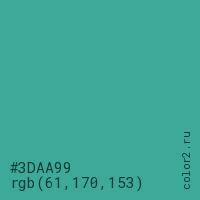 Цвет #3DAA99 в цветовой модели RGB обозначается тремя октетами (61, 170, 153) в десятичном формате и #3DAA99 в шестнадцатиричном (hex) формате, которые являются интенсивностью красного 61 (hex 3D), интенсивность зелёного 170 (hex AA) и интенсивность синего 153 (hex 99).