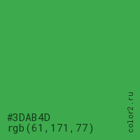 Цвет #3DAB4D в цветовой модели RGB обозначается тремя октетами (61, 171, 77) в десятичном формате и #3DAB4D в шестнадцатиричном (hex) формате, которые являются интенсивностью красного 61 (hex 3D), интенсивность зелёного 171 (hex AB) и интенсивность синего 77 (hex 4D).