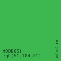 Цвет #3DB851 в цветовой модели RGB обозначается тремя октетами (61, 184, 81) в десятичном формате и #3DB851 в шестнадцатиричном (hex) формате, которые являются интенсивностью красного 61 (hex 3D), интенсивность зелёного 184 (hex B8) и интенсивность синего 81 (hex 51).
