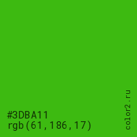 Цвет #3DBA11 в цветовой модели RGB обозначается тремя октетами (61, 186, 17) в десятичном формате и #3DBA11 в шестнадцатиричном (hex) формате, которые являются интенсивностью красного 61 (hex 3D), интенсивность зелёного 186 (hex BA) и интенсивность синего 17 (hex 11).