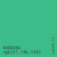 Цвет #3DBA8A в цветовой модели RGB обозначается тремя октетами (61, 186, 138) в десятичном формате и #3DBA8A в шестнадцатиричном (hex) формате, которые являются интенсивностью красного 61 (hex 3D), интенсивность зелёного 186 (hex BA) и интенсивность синего 138 (hex 8A).