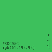 Цвет #3DC05C в цветовой модели RGB обозначается тремя октетами (61, 192, 92) в десятичном формате и #3DC05C в шестнадцатиричном (hex) формате, которые являются интенсивностью красного 61 (hex 3D), интенсивность зелёного 192 (hex C0) и интенсивность синего 92 (hex 5C).