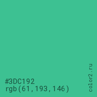 Цвет #3DC192 в цветовой модели RGB обозначается тремя октетами (61, 193, 146) в десятичном формате и #3DC192 в шестнадцатиричном (hex) формате, которые являются интенсивностью красного 61 (hex 3D), интенсивность зелёного 193 (hex C1) и интенсивность синего 146 (hex 92).
