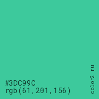 Цвет #3DC99C в цветовой модели RGB обозначается тремя октетами (61, 201, 156) в десятичном формате и #3DC99C в шестнадцатиричном (hex) формате, которые являются интенсивностью красного 61 (hex 3D), интенсивность зелёного 201 (hex C9) и интенсивность синего 156 (hex 9C).