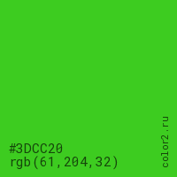Цвет #3DCC20 в цветовой модели RGB обозначается тремя октетами (61, 204, 32) в десятичном формате и #3DCC20 в шестнадцатиричном (hex) формате, которые являются интенсивностью красного 61 (hex 3D), интенсивность зелёного 204 (hex CC) и интенсивность синего 32 (hex 20).