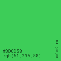 Цвет #3DCD58 в цветовой модели RGB обозначается тремя октетами (61, 205, 88) в десятичном формате и #3DCD58 в шестнадцатиричном (hex) формате, которые являются интенсивностью красного 61 (hex 3D), интенсивность зелёного 205 (hex CD) и интенсивность синего 88 (hex 58).