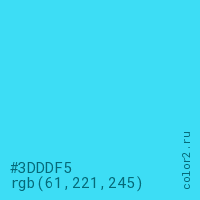 Цвет #3DDDF5 в цветовой модели RGB обозначается тремя октетами (61, 221, 245) в десятичном формате и #3DDDF5 в шестнадцатиричном (hex) формате, которые являются интенсивностью красного 61 (hex 3D), интенсивность зелёного 221 (hex DD) и интенсивность синего 245 (hex F5).
