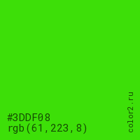 Цвет #3DDF08 в цветовой модели RGB обозначается тремя октетами (61, 223, 8) в десятичном формате и #3DDF08 в шестнадцатиричном (hex) формате, которые являются интенсивностью красного 61 (hex 3D), интенсивность зелёного 223 (hex DF) и интенсивность синего 8 (hex 08).