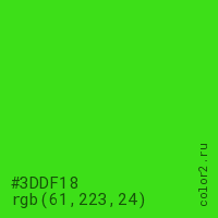 Цвет #3DDF18 в цветовой модели RGB обозначается тремя октетами (61, 223, 24) в десятичном формате и #3DDF18 в шестнадцатиричном (hex) формате, которые являются интенсивностью красного 61 (hex 3D), интенсивность зелёного 223 (hex DF) и интенсивность синего 24 (hex 18).