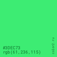 Цвет #3DEC73 в цветовой модели RGB обозначается тремя октетами (61, 236, 115) в десятичном формате и #3DEC73 в шестнадцатиричном (hex) формате, которые являются интенсивностью красного 61 (hex 3D), интенсивность зелёного 236 (hex EC) и интенсивность синего 115 (hex 73).