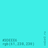 Цвет #3DEEE6 в цветовой модели RGB обозначается тремя октетами (61, 238, 230) в десятичном формате и #3DEEE6 в шестнадцатиричном (hex) формате, которые являются интенсивностью красного 61 (hex 3D), интенсивность зелёного 238 (hex EE) и интенсивность синего 230 (hex E6).