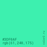 Цвет #3DF0AF в цветовой модели RGB обозначается тремя октетами (61, 240, 175) в десятичном формате и #3DF0AF в шестнадцатиричном (hex) формате, которые являются интенсивностью красного 61 (hex 3D), интенсивность зелёного 240 (hex F0) и интенсивность синего 175 (hex AF).