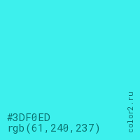 Цвет #3DF0ED в цветовой модели RGB обозначается тремя октетами (61, 240, 237) в десятичном формате и #3DF0ED в шестнадцатиричном (hex) формате, которые являются интенсивностью красного 61 (hex 3D), интенсивность зелёного 240 (hex F0) и интенсивность синего 237 (hex ED).