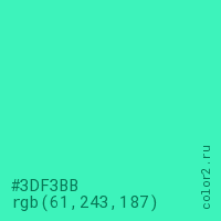 Цвет #3DF3BB в цветовой модели RGB обозначается тремя октетами (61, 243, 187) в десятичном формате и #3DF3BB в шестнадцатиричном (hex) формате, которые являются интенсивностью красного 61 (hex 3D), интенсивность зелёного 243 (hex F3) и интенсивность синего 187 (hex BB).