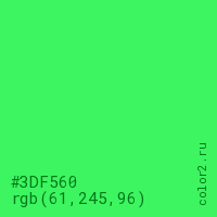 Цвет #3DF560 в цветовой модели RGB обозначается тремя октетами (61, 245, 96) в десятичном формате и #3DF560 в шестнадцатиричном (hex) формате, которые являются интенсивностью красного 61 (hex 3D), интенсивность зелёного 245 (hex F5) и интенсивность синего 96 (hex 60).