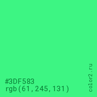Цвет #3DF583 в цветовой модели RGB обозначается тремя октетами (61, 245, 131) в десятичном формате и #3DF583 в шестнадцатиричном (hex) формате, которые являются интенсивностью красного 61 (hex 3D), интенсивность зелёного 245 (hex F5) и интенсивность синего 131 (hex 83).