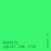Цвет #3DF672 в цветовой модели RGB обозначается тремя октетами (61, 246, 114) в десятичном формате и #3DF672 в шестнадцатиричном (hex) формате, которые являются интенсивностью красного 61 (hex 3D), интенсивность зелёного 246 (hex F6) и интенсивность синего 114 (hex 72).