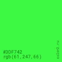 Цвет #3DF742 в цветовой модели RGB обозначается тремя октетами (61, 247, 66) в десятичном формате и #3DF742 в шестнадцатиричном (hex) формате, которые являются интенсивностью красного 61 (hex 3D), интенсивность зелёного 247 (hex F7) и интенсивность синего 66 (hex 42).