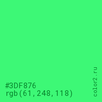Цвет #3DF876 в цветовой модели RGB обозначается тремя октетами (61, 248, 118) в десятичном формате и #3DF876 в шестнадцатиричном (hex) формате, которые являются интенсивностью красного 61 (hex 3D), интенсивность зелёного 248 (hex F8) и интенсивность синего 118 (hex 76).