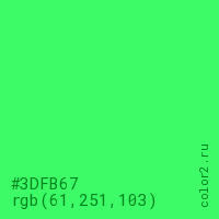 Цвет #3DFB67 в цветовой модели RGB обозначается тремя октетами (61, 251, 103) в десятичном формате и #3DFB67 в шестнадцатиричном (hex) формате, которые являются интенсивностью красного 61 (hex 3D), интенсивность зелёного 251 (hex FB) и интенсивность синего 103 (hex 67).