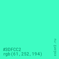 Цвет #3DFCC2 в цветовой модели RGB обозначается тремя октетами (61, 252, 194) в десятичном формате и #3DFCC2 в шестнадцатиричном (hex) формате, которые являются интенсивностью красного 61 (hex 3D), интенсивность зелёного 252 (hex FC) и интенсивность синего 194 (hex C2).