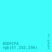 Цвет #3DFCFA в цветовой модели RGB обозначается тремя октетами (61, 252, 250) в десятичном формате и #3DFCFA в шестнадцатиричном (hex) формате, которые являются интенсивностью красного 61 (hex 3D), интенсивность зелёного 252 (hex FC) и интенсивность синего 250 (hex FA).
