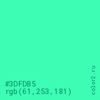 Цвет #3DFDB5 в цветовой модели RGB обозначается тремя октетами (61, 253, 181) в десятичном формате и #3DFDB5 в шестнадцатиричном (hex) формате, которые являются интенсивностью красного 61 (hex 3D), интенсивность зелёного 253 (hex FD) и интенсивность синего 181 (hex B5).