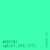 Цвет #3DFFB1 в цветовой модели RGB обозначается тремя октетами (61, 255, 177) в десятичном формате и #3DFFB1 в шестнадцатиричном (hex) формате, которые являются интенсивностью красного 61 (hex 3D), интенсивность зелёного 255 (hex FF) и интенсивность синего 177 (hex B1).