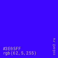 Цвет #3E05FF в цветовой модели RGB обозначается тремя октетами (62, 5, 255) в десятичном формате и #3E05FF в шестнадцатиричном (hex) формате, которые являются интенсивностью красного 62 (hex 3E), интенсивность зелёного 5 (hex 05) и интенсивность синего 255 (hex FF).