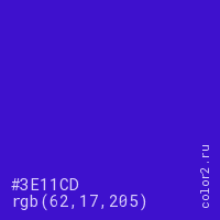Цвет #3E11CD в цветовой модели RGB обозначается тремя октетами (62, 17, 205) в десятичном формате и #3E11CD в шестнадцатиричном (hex) формате, которые являются интенсивностью красного 62 (hex 3E), интенсивность зелёного 17 (hex 11) и интенсивность синего 205 (hex CD).