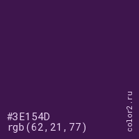 Цвет #3E154D в цветовой модели RGB обозначается тремя октетами (62, 21, 77) в десятичном формате и #3E154D в шестнадцатиричном (hex) формате, которые являются интенсивностью красного 62 (hex 3E), интенсивность зелёного 21 (hex 15) и интенсивность синего 77 (hex 4D).