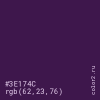 Цвет #3E174C в цветовой модели RGB обозначается тремя октетами (62, 23, 76) в десятичном формате и #3E174C в шестнадцатиричном (hex) формате, которые являются интенсивностью красного 62 (hex 3E), интенсивность зелёного 23 (hex 17) и интенсивность синего 76 (hex 4C).
