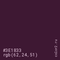 Цвет #3E1833 в цветовой модели RGB обозначается тремя октетами (62, 24, 51) в десятичном формате и #3E1833 в шестнадцатиричном (hex) формате, которые являются интенсивностью красного 62 (hex 3E), интенсивность зелёного 24 (hex 18) и интенсивность синего 51 (hex 33).