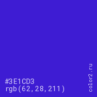 Цвет #3E1CD3 в цветовой модели RGB обозначается тремя октетами (62, 28, 211) в десятичном формате и #3E1CD3 в шестнадцатиричном (hex) формате, которые являются интенсивностью красного 62 (hex 3E), интенсивность зелёного 28 (hex 1C) и интенсивность синего 211 (hex D3).