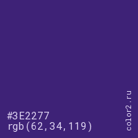 Цвет #3E2277 в цветовой модели RGB обозначается тремя октетами (62, 34, 119) в десятичном формате и #3E2277 в шестнадцатиричном (hex) формате, которые являются интенсивностью красного 62 (hex 3E), интенсивность зелёного 34 (hex 22) и интенсивность синего 119 (hex 77).