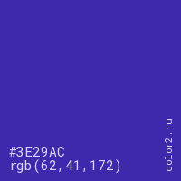 Цвет #3E29AC в цветовой модели RGB обозначается тремя октетами (62, 41, 172) в десятичном формате и #3E29AC в шестнадцатиричном (hex) формате, которые являются интенсивностью красного 62 (hex 3E), интенсивность зелёного 41 (hex 29) и интенсивность синего 172 (hex AC).