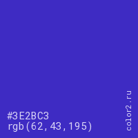 Цвет #3E2BC3 в цветовой модели RGB обозначается тремя октетами (62, 43, 195) в десятичном формате и #3E2BC3 в шестнадцатиричном (hex) формате, которые являются интенсивностью красного 62 (hex 3E), интенсивность зелёного 43 (hex 2B) и интенсивность синего 195 (hex C3).