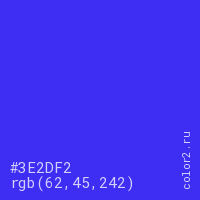 Цвет #3E2DF2 в цветовой модели RGB обозначается тремя октетами (62, 45, 242) в десятичном формате и #3E2DF2 в шестнадцатиричном (hex) формате, которые являются интенсивностью красного 62 (hex 3E), интенсивность зелёного 45 (hex 2D) и интенсивность синего 242 (hex F2).