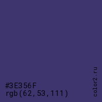 Цвет #3E356F в цветовой модели RGB обозначается тремя октетами (62, 53, 111) в десятичном формате и #3E356F в шестнадцатиричном (hex) формате, которые являются интенсивностью красного 62 (hex 3E), интенсивность зелёного 53 (hex 35) и интенсивность синего 111 (hex 6F).