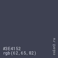 Цвет #3E4152 в цветовой модели RGB обозначается тремя октетами (62, 65, 82) в десятичном формате и #3E4152 в шестнадцатиричном (hex) формате, которые являются интенсивностью красного 62 (hex 3E), интенсивность зелёного 65 (hex 41) и интенсивность синего 82 (hex 52).