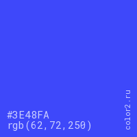 Цвет #3E48FA в цветовой модели RGB обозначается тремя октетами (62, 72, 250) в десятичном формате и #3E48FA в шестнадцатиричном (hex) формате, которые являются интенсивностью красного 62 (hex 3E), интенсивность зелёного 72 (hex 48) и интенсивность синего 250 (hex FA).